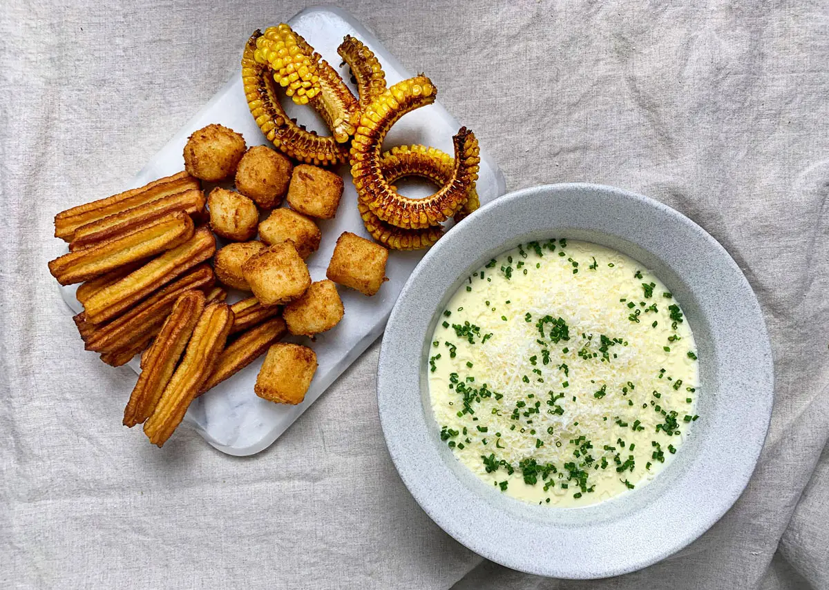 Shocked that this retro fave made the list? Melted cheese and dippers will never go out of style. Travel back in time with a cheese fondue appetiser! We've used raclette and smoked Stanford cheese to make those Instaworthy cheese pulls. Bring this retro classic to the present by replacing the toasted bread cubes with air-fried potato tots, sweet potato churros and corn riblets.