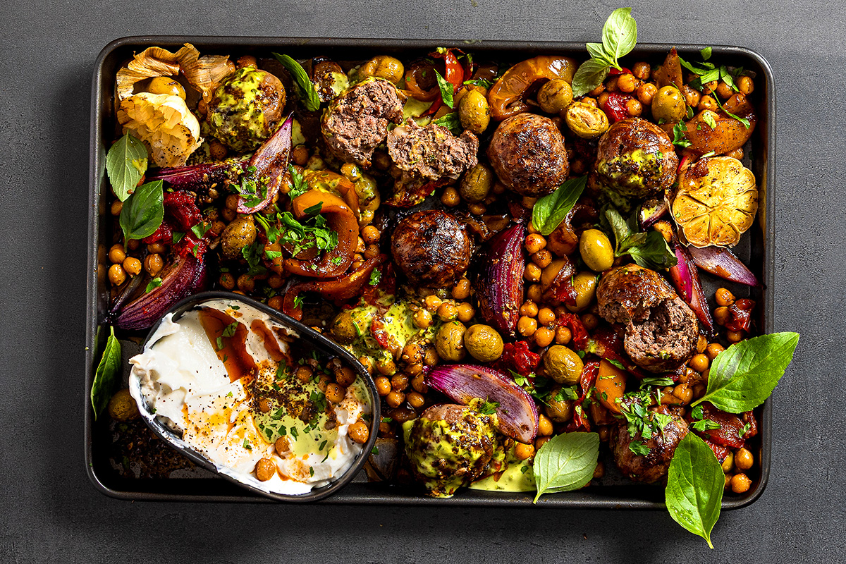This hearty traybake brings big flavour with minimal effort. Caul fat-wrapped ostrich frikkadels are roasted until golden, and nestled into a medley of chickpeas, pickled peppers, sundried tomatoes, olives and garlic. It’s all seasoned with smoky paprika, za’atar and olive oil, creating a richly spiced base. The creamy tahini yoghurt and herby basil mayo topping take it over the top – perfect for sharing, scooping or serving with warm flatbreads.