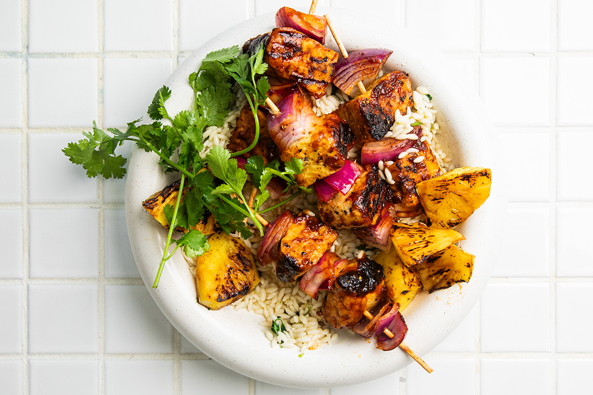 Chickpea tempeh skewers with pineapple salsa