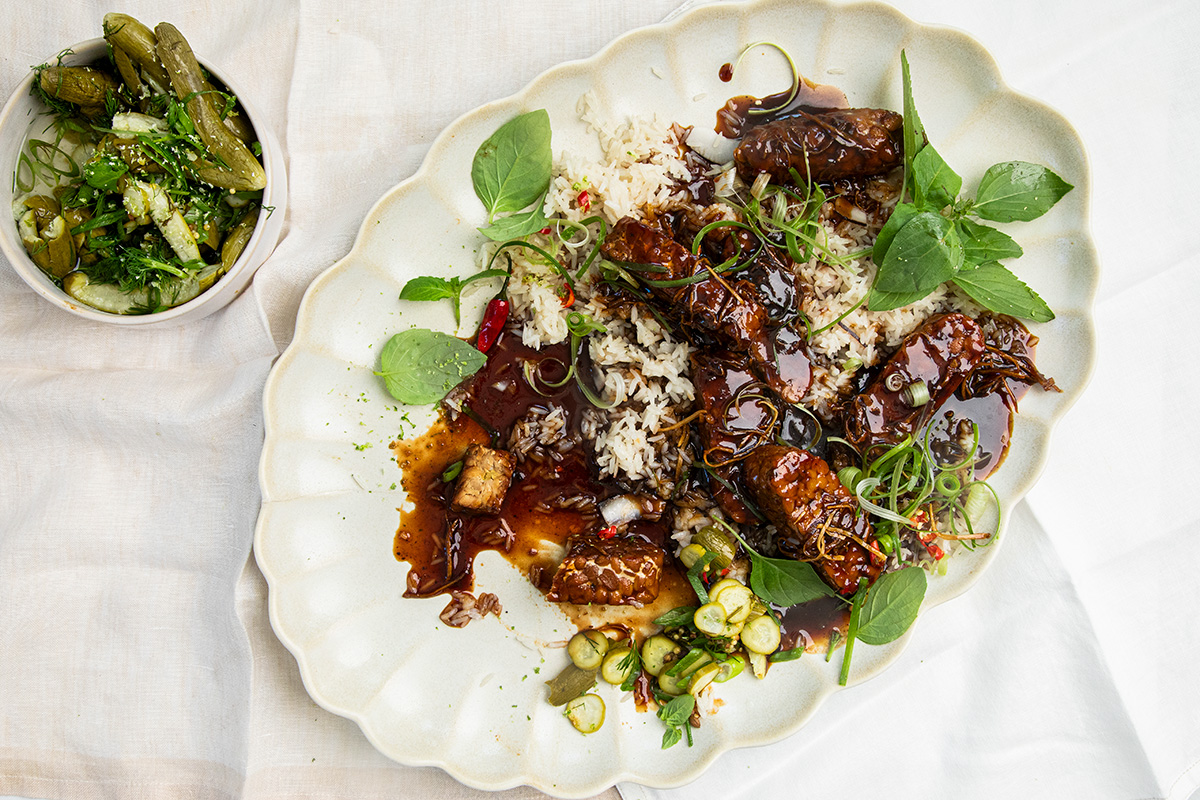 Soy tempeh coated in a sticky, ginger sauce meets crisp, tangy pickled cucumber. The result is a bold, flavour-packed dish with a pleasing contrast of textures – the tempeh is rich and chewy, the pickles refresh and brighten every bite.