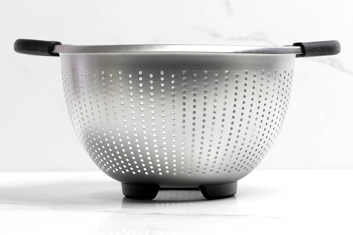 Whether you’re rinsing apples or draining pasta, the elevated, non-slip handles of the OXO colander provide a firm and comfortable grip, even when handling large batches. Constructed with three feet at its base, it delivers stability in the sink and on the countertop, while the perforated design ensures fast and thorough draining.