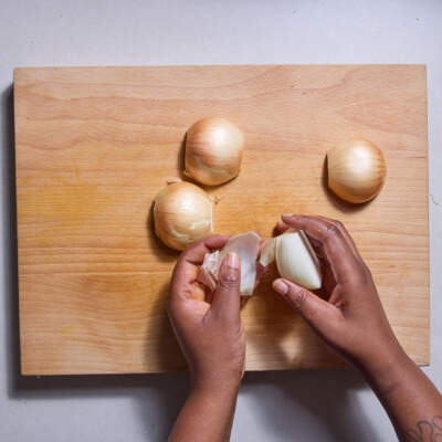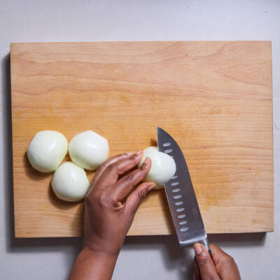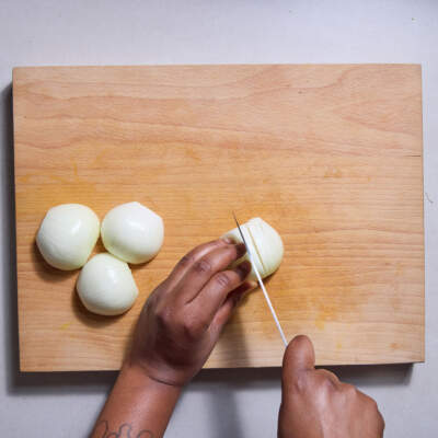 Slice the onion in half vertically, from root to stem, so you have two halves. Slice off the top and the root end.