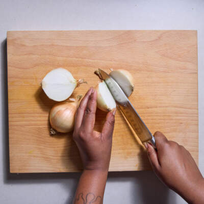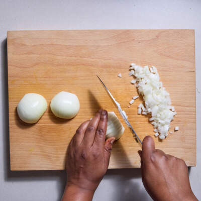 Chill the onion for a bit before cutting, or cut it under running water, to prevent the onion’s sulfuric compounds from burning your eyes. Use a sharp knife to avoid slipping and try to keep your fingers tucked in to protect them.