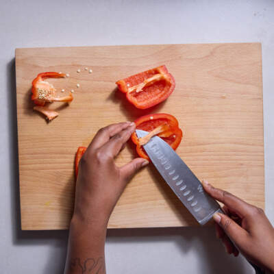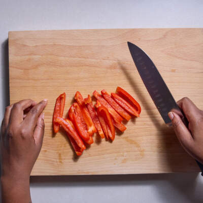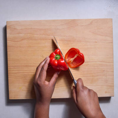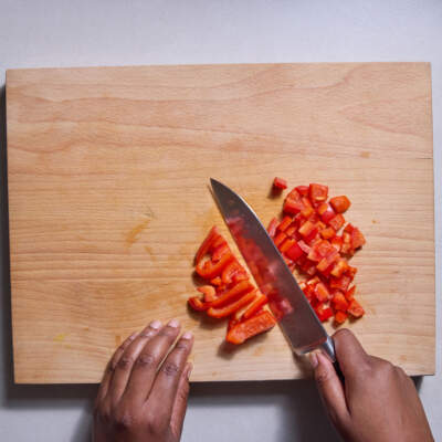 Lay the pepper flat with the inside facing up. Slice it lengthways into strips, depending on how thick you want your dice.