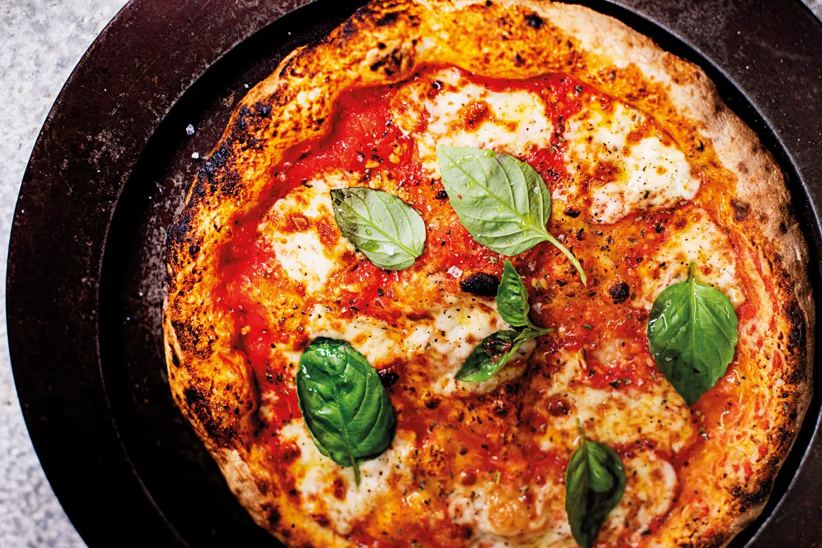 Our base has to cook as fast and as hot as possible for 2–5 minutes in a hot pizza oven. If you don’t have a pizza oven, cook the base in a hot cast-iron pan over a high heat on the stove, then flip over and top with your preferred toppings and finish off in the oven. Preheat the oven to its highest temperature, then turn on the grill just before baking the pizza for best results. Once you’ve put the sauce on the base, move quickly to get it into the oven – if it sits for too long, you risk sogginess, which nobody likes.