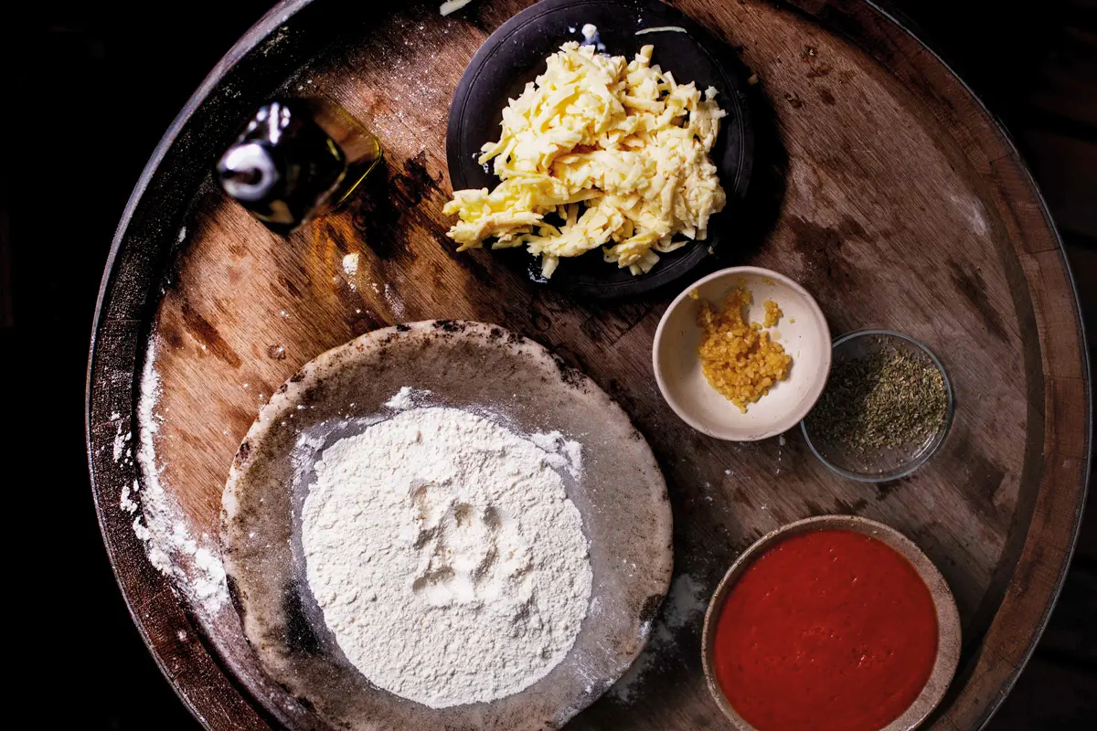 When making your base, use flour with a high protein content as this helps the dough to stretch; “00” flour is the gold standard, which means you’ll get the perfect combination of crispiness and chewiness. Ordinary cake flour works, too.