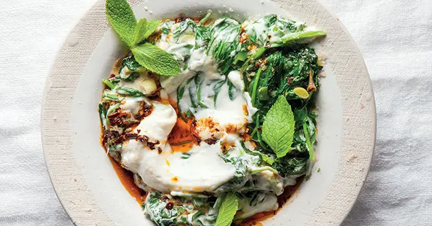 Get the creamed spinach with smoked chilli-yoghurt recipe here.