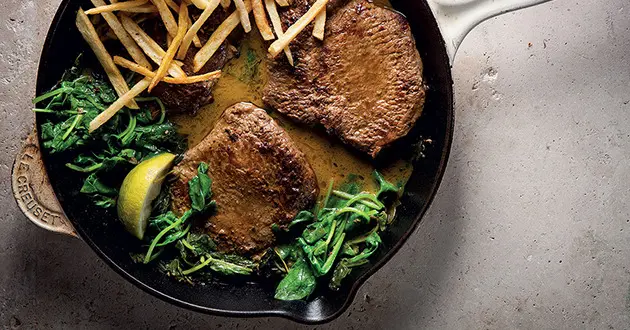 Get the steak with anchovy-spinach sauce and matchstick fries recipe here.