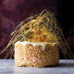 8. To assemble the cake, use the buttercream icing to sandwich together the cakes, then top with the fudgy icing and Rice Krispie clusters.