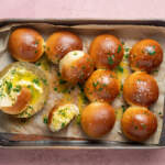 6. Remove from the oven and immediately pat the rolls with a clean, damp tea towel, then brush with melted butter. Brush with butter again, then cool on a wire rack. Serve cool.
