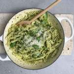 3. Add the hot, drained pasta to the pesto and toss to coat, season to taste and sprinkle with grated hard cheese.