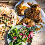 6. Toss the coriander, mint, spring onion, pickled onions and their pickling liquid and 1 T olive oil. Season to taste and serve with chicken and flatbread.