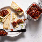 2. Remove the bay leaf. Using gloves, carefully remove the bones and cartilage from the meat. Chop the meat into small chunks and combine with a small amount of the cooking liquid and the dill. Line a 20 cm loaf tin with clingwrap, then tightly pack the meat into the tin and cover. Chill overnight. Once set, slice thinly and serve with the hot vetkoek, pickles and mustard.