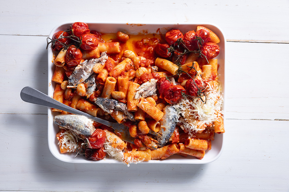 Sardine rigatoni with blistered tomatoes