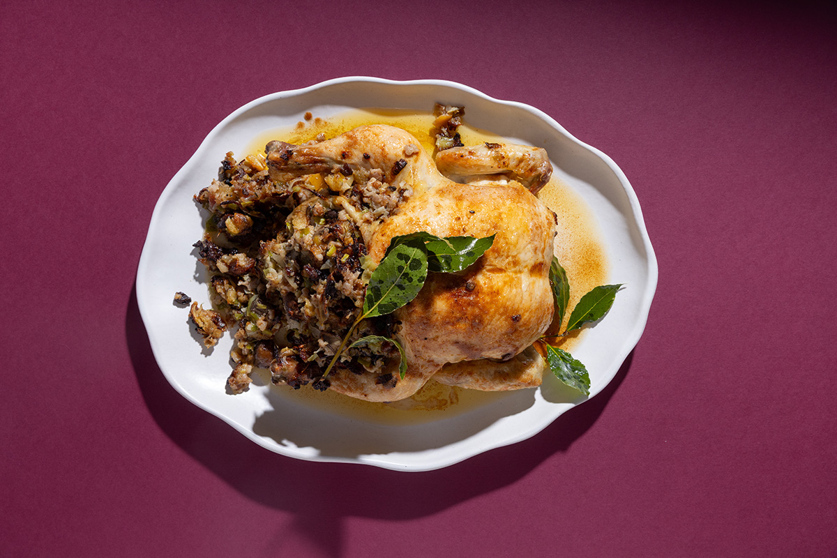 Whether you serve it with roast turkey, porchetta or on its own by the bowlful, this is the stuffing that keeps on giving. Chop and sauté leeks, onions and garlic, then add diced portabellini mushrooms, followed by the meat from a couple of pork bangers. Stir through dried cubes of panettone. Add flaked pecans or almonds if you like.