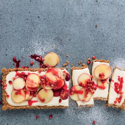 5. Slice and serve topped with the nectarines and pomegranate rubies.
