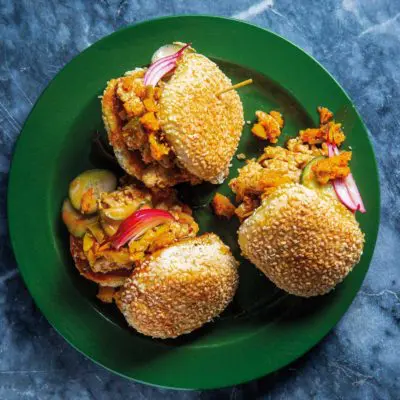 2. In the same pan, gently cook the onion in 2 T olive oil until soft but still pale. Stir in the garlic. Add the diced brinjal and 1–2 T more oil. Stir to coat, then cover and cook gently for 5 minutes until starting to soften. Stir in the tomatoes. Season and cook for a few minutes.