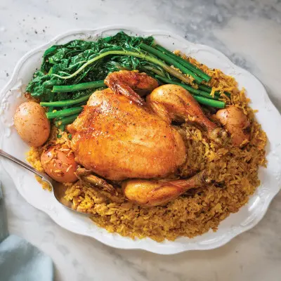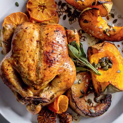 Sticky ClemenGold-glazed roast chicken with pumpkin wedges