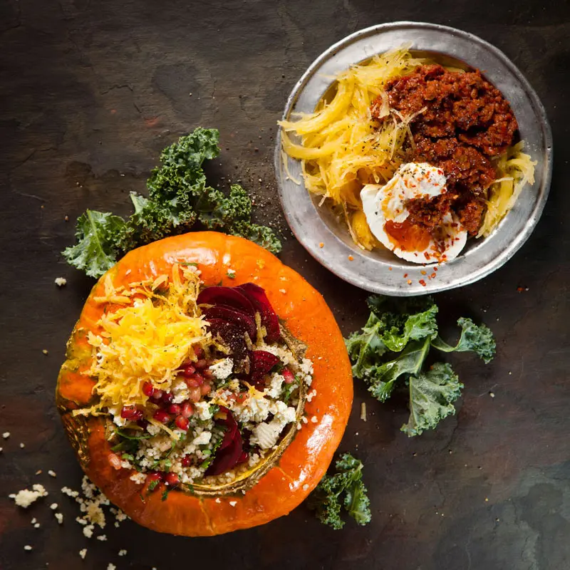 BOTTOM LEFT: Tabbouleh-stuffed turk's turban TOP RIGHT: Spaghetti squash bolognese[/caption]