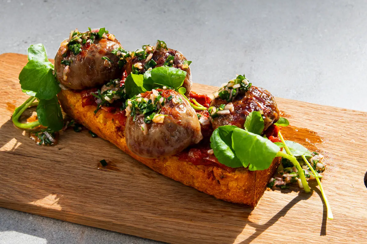 Edge Restaurant executive chef Vusi Ndlovu’s secret to making perfect skilpadjies is to cook them low and slow on the coals. He serves them on toasted cornbread with Soweto sauce and chimichurri to make the ultimate South African meatball sub.