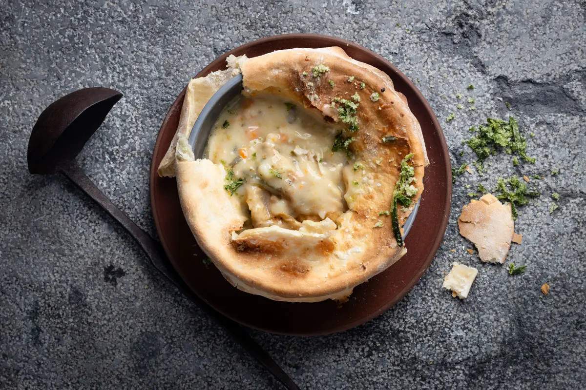 Get the recipe for baked chicken soup pie with flatbread topping here.