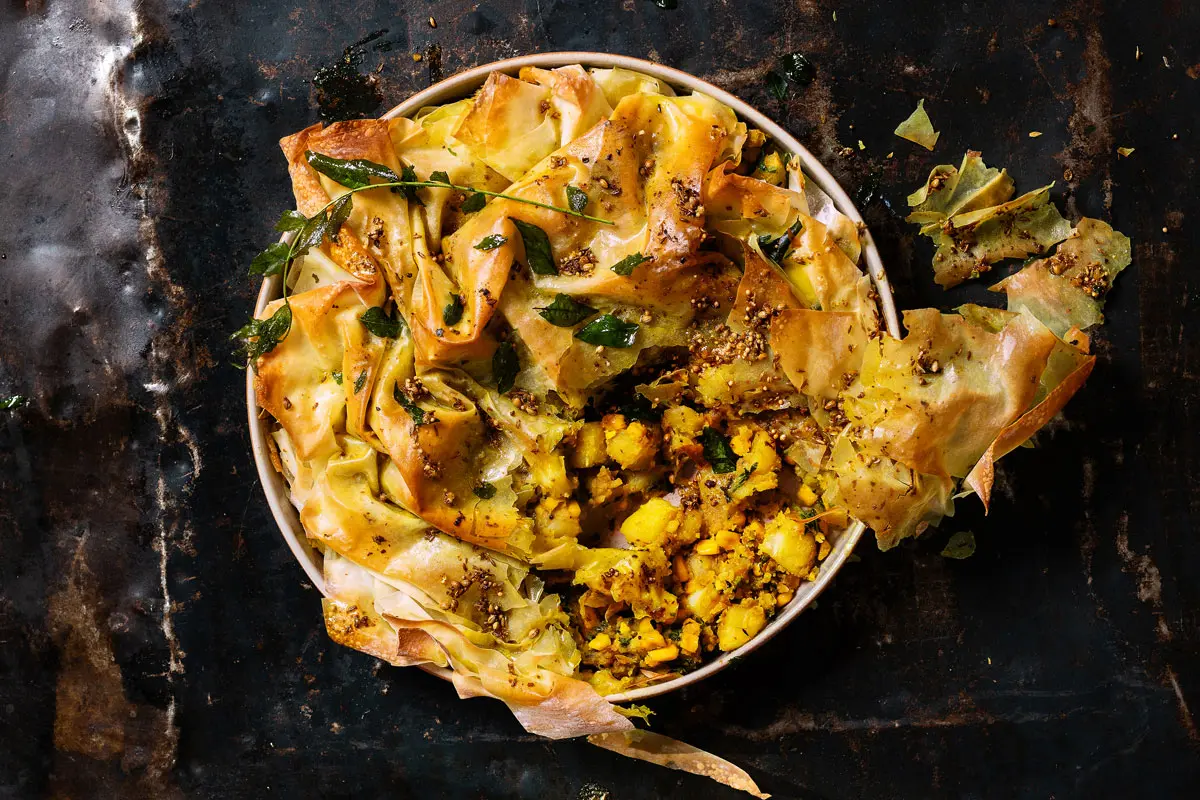 Go big or go home with Keletso Motau's potato and corn samoosa-inspired phyllo pastry-topped pie. If corn and potato samoosas aren't your favourite, feel free to swap the filling with your best combos.